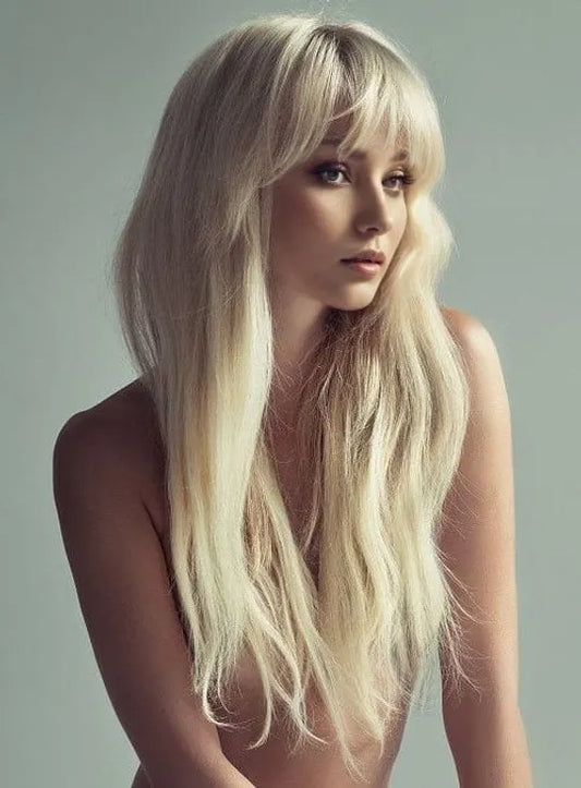 Women's Long Straight Hairstyles Blonde Color Synthetic Hair Capless Wigs With Bangs 24Inch