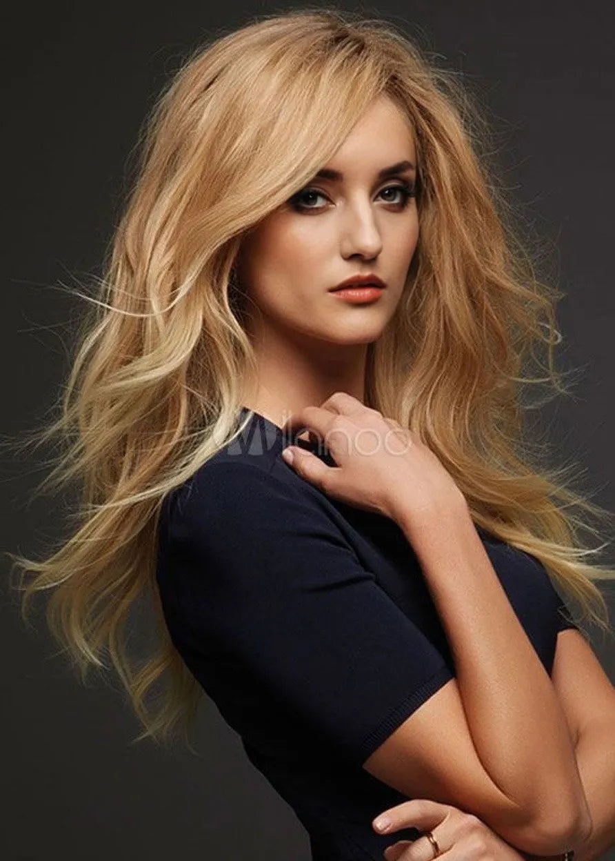 Locker gewellte, geschichtete Frisur mit vollem Pony, mittellange, synthetische, kappenlose Damenperücken, 24 Zoll