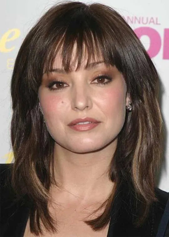 Mittellange Frisuren Damen Natürliche Glatte Stufen Kunsthaar Kappenlose Perücken Mit Pony 16 Zoll
