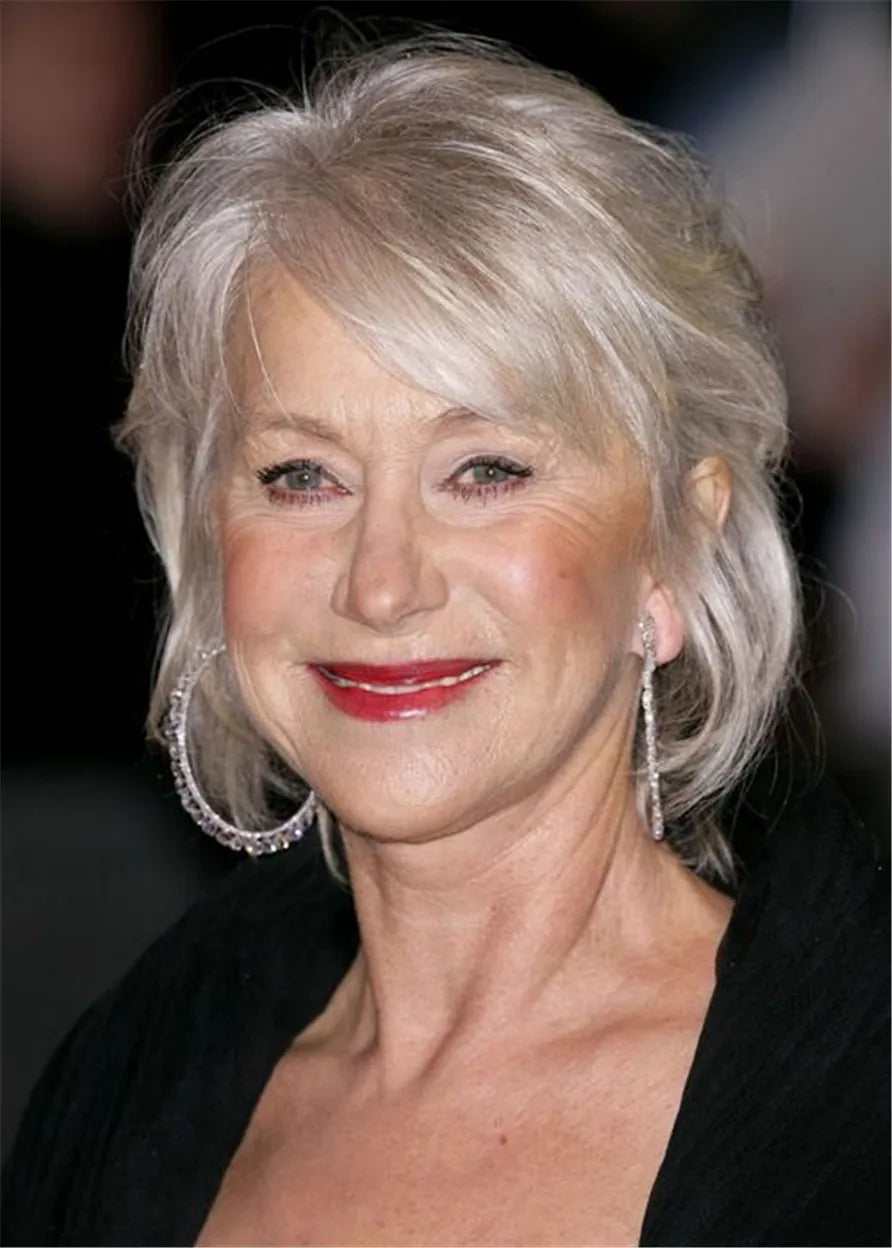 Mittellanger Shag-Bob, Frisuren, natürlich gewelltes Echthaar, mit Pony an der Seite, kappenlose Perücken, 14 Zoll