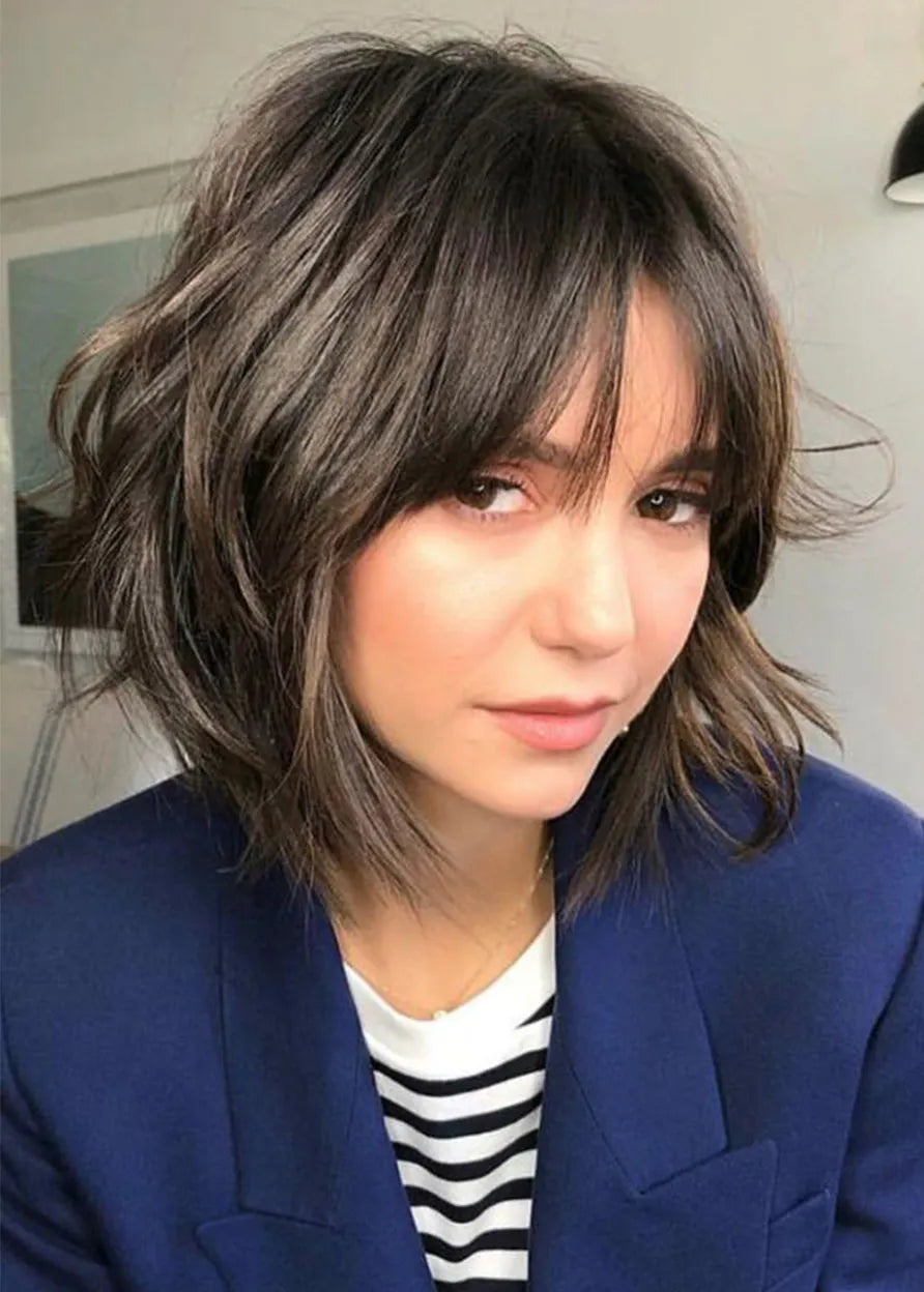 Kurze geschichtete Frisuren Damen welliges Kunsthaar Kappenlose Perücken mit Pony 12 Zoll