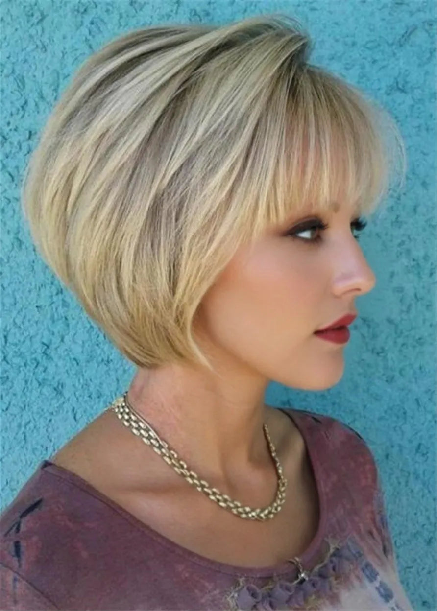 Kurze, gestufte, kinnlange Bob-Perücke aus Echthaar mit glatter Oberfläche