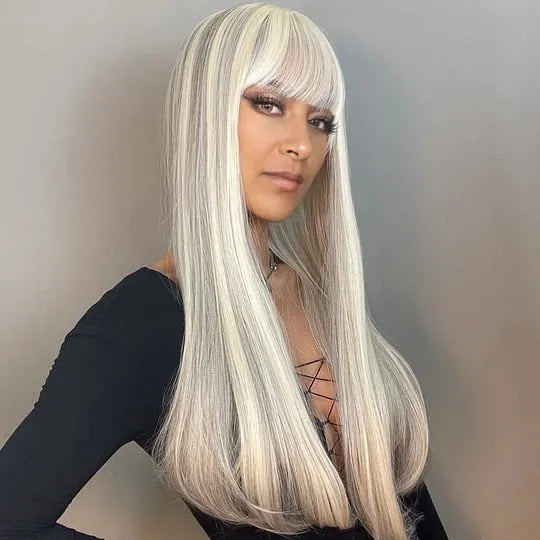 Silberweiße lange Frisur, natürliches glattes Kunsthaar mit Pony, 28 Zoll
